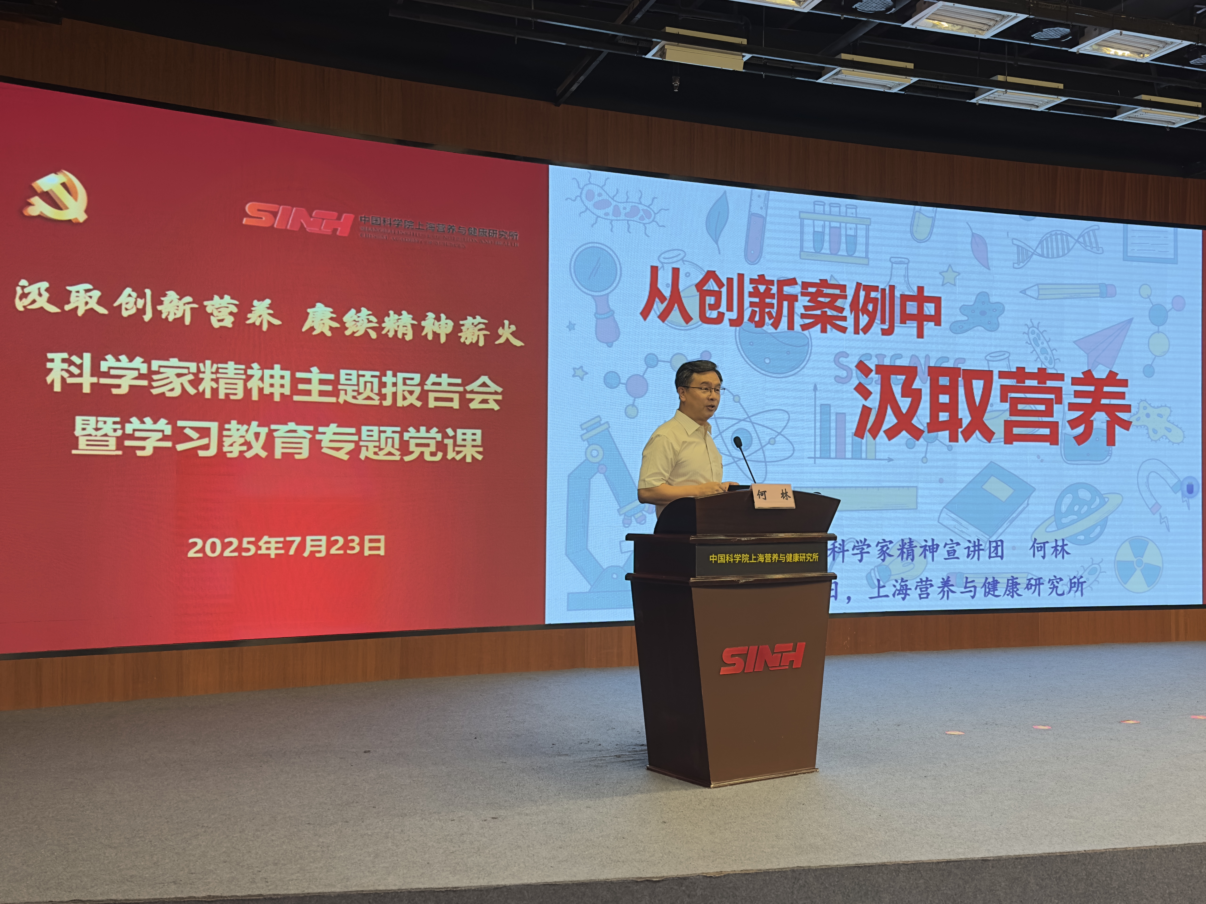 7月23日,中国科学院上海营养与健康研究所举办“汲取创新营养 赓续精神薪火”科学家精神主题报告会暨学习教育专题党课,特邀中国科学院科学家精神宣讲团成员何林作专题报告。研究所各党(总)支部书记、职能部门负责人、科研骨干及青年代表等百余人参加学习,党委书记瞿荣辉主持报告会。