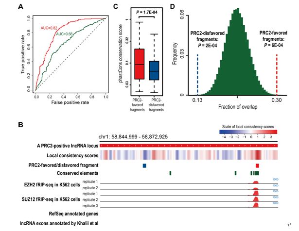 图:PRC2结合lncRNA的序列特征在lncRNA上的分布表现出明显的非随机性, 并且这些序列特征的局域富集具有明确的功能意义
