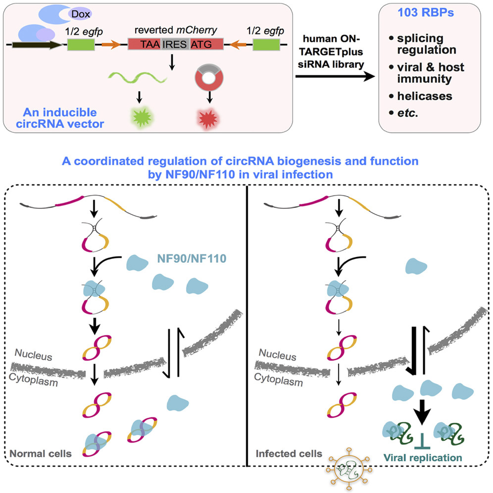 图:全基因组筛选以及NF90/NF110对circRNA表达和病毒免疫功能的调控机制
