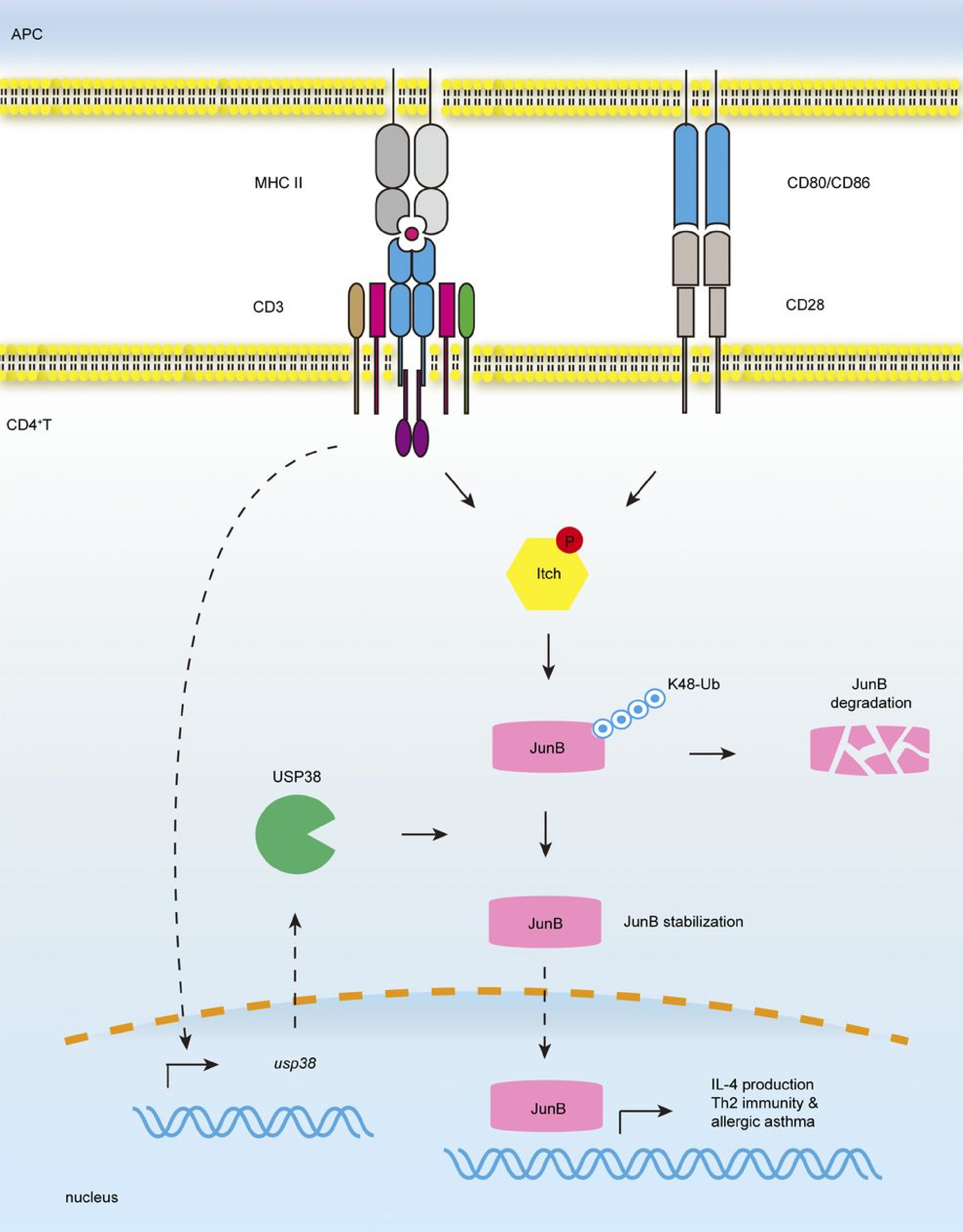 该研究首次鉴定出参与Th2细胞分化的去泛素化酶。现有研究发现TCR信号能够通过JNK激活泛素化酶Itch的活性,从而促进JunB的降解,我们的研究发现Itch并不能被TCR诱导,因此,USP38的诱导能够反作用于JNK-Itch信号,成为调节TCR下游信号事件的检验点,为理解2型免疫及其相关疾病提供了更为丰富的理论基础和潜在的特异性治疗靶点。