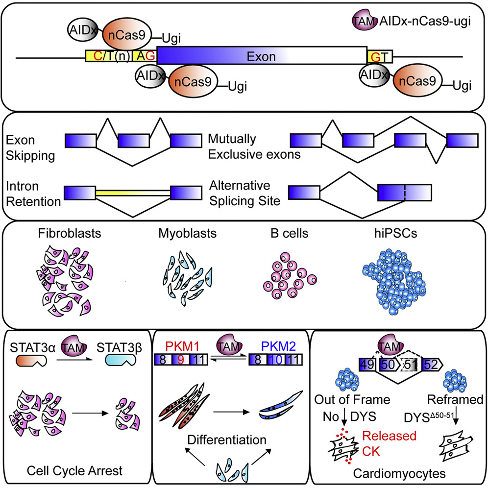 最后,研究人员探索了利用TAM修复杜氏肌营养不良症(DMD)的可行性。DMD是一种致命的遗传疾?。ǚ⒉÷誓行灾校?4000)。其发病原因在于,遗传突变造成Dystrophin蛋白的完全缺失,引发肌肉萎缩和瘫痪,最终造成心脏或肺功能的衰竭。如果通过外显子跳读,能产生内部截短的Dystrophin蛋白,可以达到对DMD的治疗效果。因此研究人员构建了DMD病人来源的诱导型多能干细胞, 此病人因为外显子删除造成Dystrophin蛋白的完全缺失。通过在剪接位点诱导G>A的突变,研究人员实现了目标外显子的完全跳读,在所有表达TAM的细胞中恢复了Dystrophin的蛋白表达,修复了心肌细胞的缺陷。