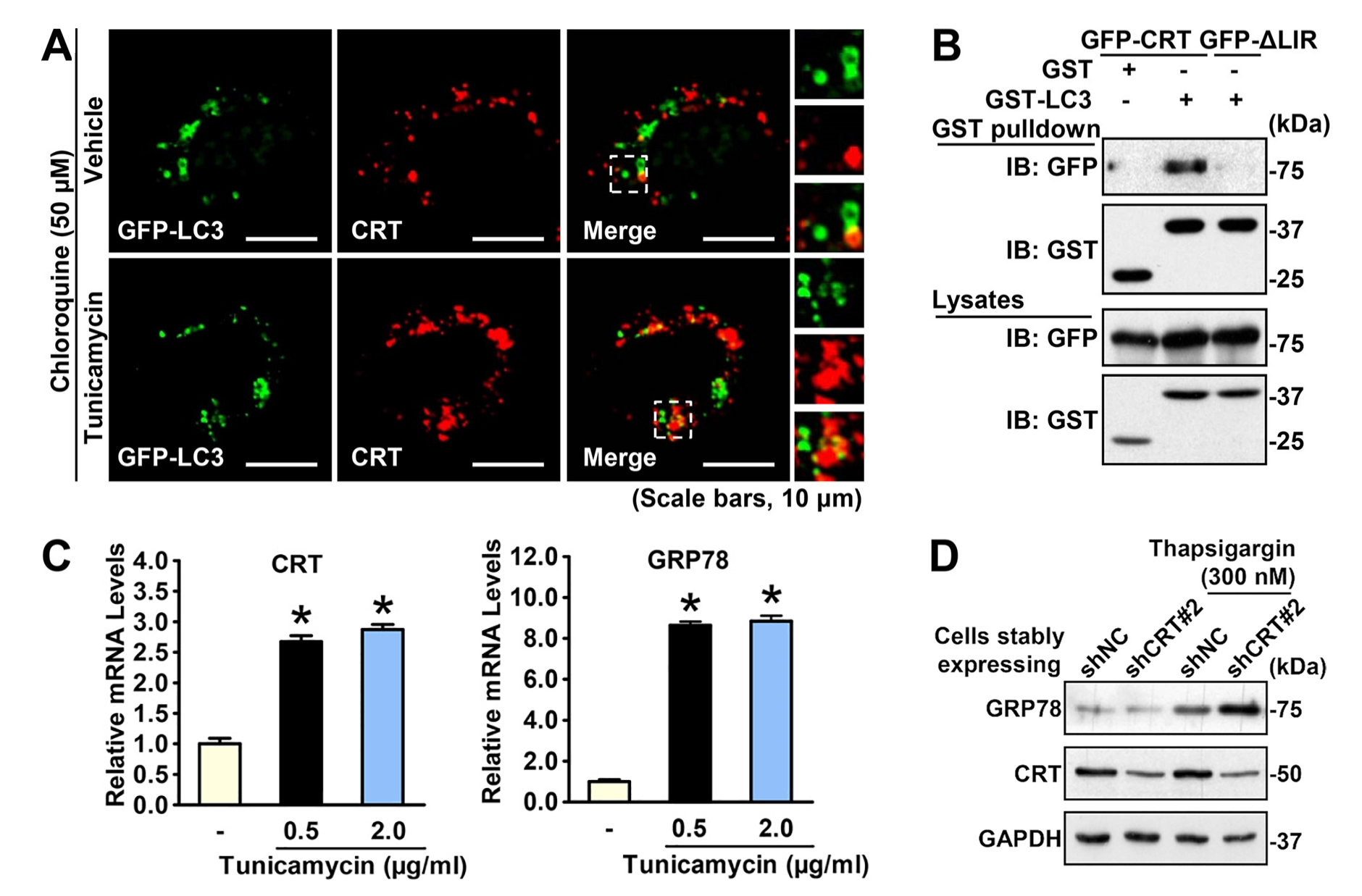 在内质网应激(ER stress)条件下,Calreticulin受非折叠蛋白反应(UPR)的诱导表达上调,高表达的Calreticulin通过保守的LIR序列与自噬相关蛋白LC3相互作用,激活细胞自噬途径,从而降解累积的异常折叠蛋白,缓解细胞应激水平。该研究表明激活Calreticulin-自噬途径可能会成为治疗内质网应激及相关代谢疾病的新策略和靶点。