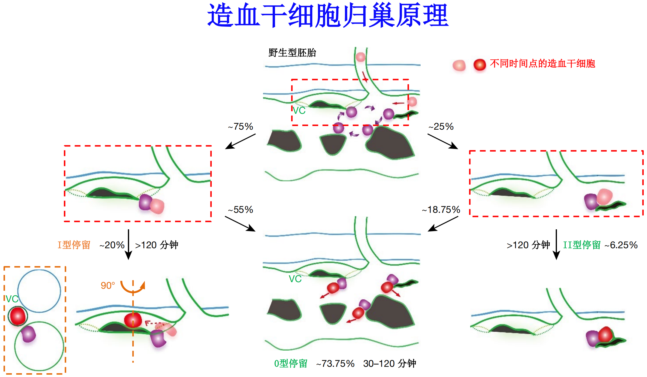 (红色代表造血干细胞,蓝色代表动脉,绿色代表静脉。)