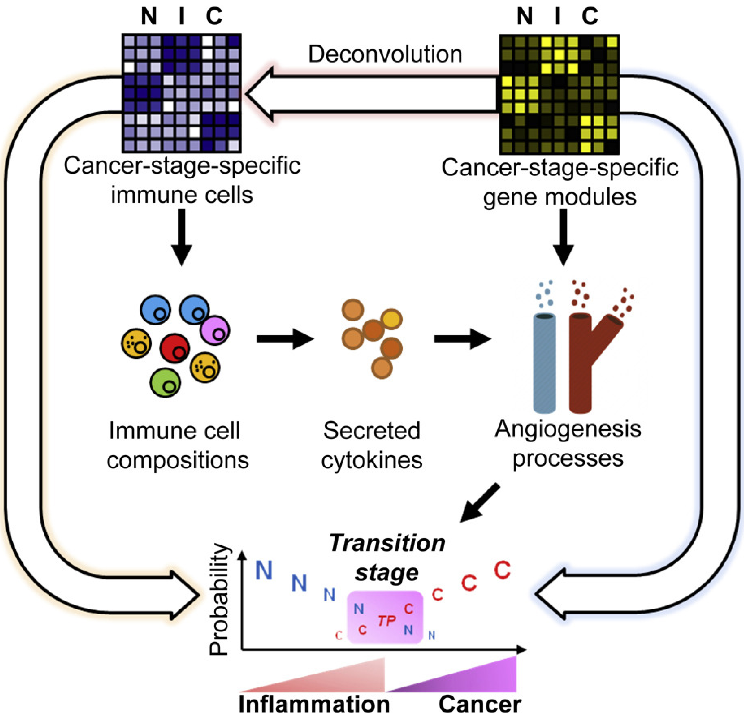 尽管人们已知慢性炎症增加多种癌症的风险,然而炎症如何促进癌症发展仍然没有被明确研究。其中,判断炎症组织何时向癌症转变至关重要。为实现无偏检测免疫细胞及其分泌因子影响炎症-癌症转变的分子机制,本课题研究人员开发了计算方法“SwitchDetector”。分别基于肝癌、胃癌和结肠癌的转录组数据,识别出血管生成作为多种癌症的炎症-癌症转变的共同关键事件;并利用浸润免疫细胞类型的组成情况、以及其分泌或抑制的胞外因子来预测该关键事件的基因表达。这些识别出的胞外因子可作为潜在的癌症前、癌症早期检测的生物标记物,并且可以与血管生成基因一起实现癌症预后和病人免疫治疗响应的准确预测。SwitchDetector软件以及炎症-癌症(inflammation-to-cancer, I2C)数据库在www.inflammation2cancer.org公开发布,可供下载和查询。