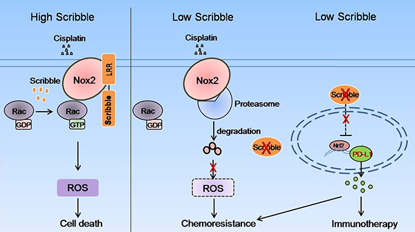 詹丽杏研究组的研究人员利用临床收集的115例NSCLC患者的化疗前肿瘤组织样本,分析Scribble蛋白水平与铂类药物化疗预后的相关性;并在另外72例NSCLC患者肿瘤组织样本中验证了Scribble蛋白水平与铂类药物化疗预后正相关。进一步证明了Scribble功能异常显著降低了顺铂敏感性。体外分子机制研究发现,Scribble与Nox2在细胞膜上共定位,而且Scribble通过LRR结构域与Nox2相互结合并增强Nox2蛋白稳定性。在顺铂处理的NSCLC细胞中,Scribble对Nox2蛋白的稳定有利于ROS的大量产生进而促进细胞凋亡,增强顺铂敏感性。Nrf2(Nuclear factor, erythroid 2 like 2)是ROS产生的重要调节因子;在黑色素瘤中Nrf2上调PD-L1表达且PD-L1促进肺癌化疗耐药产生。我们利用数据库分析和Kras肺癌模型小鼠,发现在NSCLC组织样本和耐药细胞株中,Scribble与NRF2/PDL-1显著负相关。体外研究发现,Scribble通过抑制Nrf2转录进而降低PD-L1水平,而且Scribble对Nrf2/PD-L1的负向调控部分依赖Scribble/Nox2/ROS信号通路。我们的研究发现了Scribble调控NSCLC顺铂化疗敏感性的作用和机制,并提出Scribble高表达的NSCLC患者在铂类药物化疗中预后较好,而Scribble低表达的NSCLC患者应更倾向于选择基于PD-L1/PD-1免疫抑制剂的免疫治疗,为实现NSCLC的个性化治疗提供靶标。