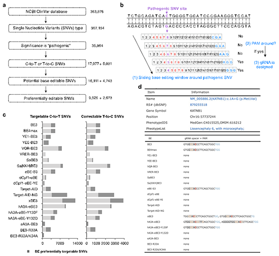 (a)可编辑的人类疾病相关单碱基突变位点的筛选流程。(b)判断人类疾病相关单碱基突变位点能否被碱基编辑器编辑的流程示意图。(c)统计20种碱基编辑器可编辑的人类疾病相关单碱基突变位点的数目。(d)BEable-GPS分析显示一个可编辑的人类疾病相关单碱基突变位点信息及相应单碱基编辑器的gRNA设计结果。