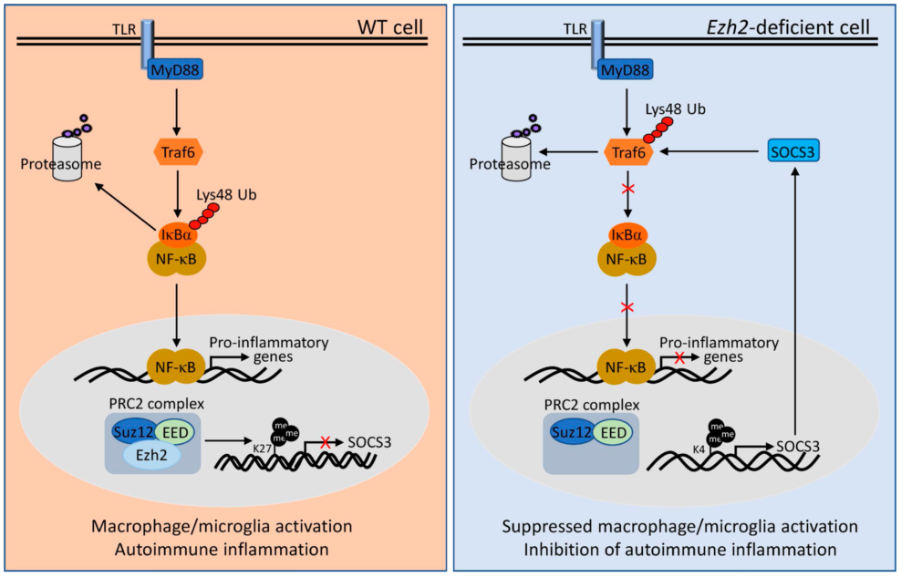 ????在本研究中,博士研究生张兴利等在肖意传和秦骏研究员的共同指导下,利用遗传小鼠模型揭示了Ezh2在巨噬细胞与小胶质细胞中通过靶向抑制抗炎症性基因Socs3的表达,进而介导了巨噬细胞与小胶质细胞在炎症部位的活化,由此促进了炎症性肠炎与实验性自身免疫性脑脊髓炎的发病。当利用Ezh2选择性抑制剂GSK126抑制H3K27me3,或当Ezh2在髓系来源的细胞中特异性敲除后,骨髓来源的巨噬细胞与小胶质细胞的炎症性活化受到了显著抑制,相应自身免疫性疾病的发病也得到了缓解。进一步分子机制研究发现,Ezh2特异性的靶向Socs3基因的启动子区域,促进了相关区域H3K27me3的表达,由此抑制了抗炎基因Socs3的表达。因此,?Ezh2缺失会显著促进Socs3基因的表达,大量产生的Socs3又介导了Traf6的泛素化降解作用,并进一步抑制了下游NF- B信号通路的活化与促炎症基因的表达(下图)。有意思的是,多发性硬化病人脑部基因表达谱数据表明,EZH2在病人脑组织中的表达相较正常人脑组织的表达有明显升高的趋势,提示EZH2可能介导了多发性硬化病理过程中小胶质细胞的炎症性活化,并参与了疾病的发生发展,因此其可作为一个潜在的自身免疫性疾病的治疗靶标。