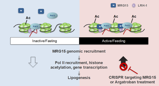 研究人员进一步针对导致MRG15节律性基因组结合上游机制进行了研究,初步发现肝脏核受体LRH-1(又名NR5A2)部分介导了MRG15在脂代谢基因转录调控区域的结合。LRH-1与MRG15存在蛋白相互作用,实验结果显示LRH-1的蛋白表达量以及LRH-1与MRG15的蛋白相互作用明显受节律和上游营养信号调控,提示了一种经由LRH-1调控MRG15基因组结合的上游营养感应机制。