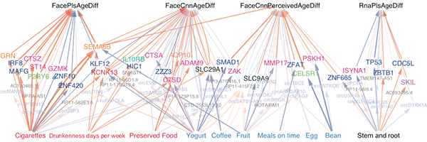 该研究综合了转录组数据、三维面部数据与生活方式调查数据三项因素,为研究者通过使用因果推断的方式,找到将三者维系在一起的分子中介提供了一个前所未有的机会。研究发现吸烟与衰老速率呈正相关,其中介分子是SEMA6B、GRN等细胞因子,其他不良的生活习惯如酗酒、食用腌制类食品等也与衰老速率呈正相关。相反的,食用酸奶、咖啡、水果、鸡、豆类等以及按时吃饭都与衰老速率呈负相关关系,其中介分子包括了组蛋白乙酰化酶复合体蛋白ZZZ3的升高、SEMA6B and SMAD1等的降低。