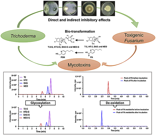 2020年9月1日,国际学术期刊Environmental Pollution在线发表了中科院上海营养与健康研究所武爱波研究组题为“Confrontation assays and mycotoxin treatment reveal antagonistic activities of Trichoderma and the fate of Fusarium mycotoxins in microbial interaction”的研究论文。该研究报道了生防木霉在与不同类型产毒真菌互作过程中,能够通过糖基化和去氧化实现对不同类型真菌毒素的脱毒转化,为发展基于木霉的真菌毒素源头防控提出了新的路径。同时,从毒素转化角度探讨了木霉与产毒真菌的互作关系,为真菌毒素污染的安全控制提供了新思路。