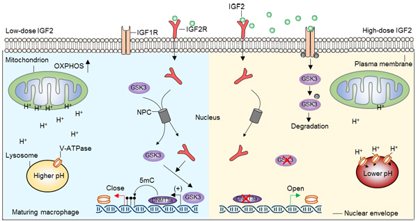 该研究组于2019年在Cell Metabolism上报道了他们干细胞研究的新发现。低氧处理的间充质干细胞借以IGF2,预编程巨噬细胞的氧化磷酸化代谢倾向性并决定其抗炎特性,有效地抑制自身免疫性疾病。在此基础上,王雪枫博士等发现IGF2对于自身免疫性疾病的治疗作用和对巨噬细胞的调控与剂量密切相关——低剂量IGF2促进抗炎巨噬细胞的形成从而缓解疾病,然而高剂量IGF2有利于促炎巨噬细胞的形成而加重疾病。鉴于IGF2与IGF2R的亲和力高于其与IGF1R的亲和力,IGF2双向调节自身免疫性疾病的特性可能与其差异性激活IGF1R和IGF2R有关,为此,研究构建了髓系细胞条件性敲除IGF1R或IGF2R的小鼠,并证明IGF2对于抗炎巨噬细胞的调控依赖于IGF2R,而其对促炎巨噬细胞的调节则主要依赖于IGF1R。通过一系列机制研究,证明低剂量IGF2优先结合IGF2R,诱导IGF2R向细胞核内化,核内IGF2R促进GSK3α/β与染色质结合来激活Dnmt3a表达,维持V型ATP酶相关基因的高甲基化状态,从而抑制V型ATP酶表达,导致溶酶体酸化受限,积累在细胞质中的H+以顺化学梯度方式进入线粒体膜间隙,推动氧化磷酸化,赋予巨噬细胞抗炎记忆。研究人员将这个H+向溶酶体内化受限,转而进入线粒体膜间隙的过程命名为质子改道(proton rechanneling)。此外,研究证明,高剂量IGF2不但结合IGF2R,还可以快速激活IGF1R-AKT信号通路,通过磷酸化GSK3α/β并抑制其功能,阻断质子改道,促进有氧糖酵解,使得巨噬细胞具有促炎功能。此外,研究发现靶向性激活IGF2R,赋予巨噬细胞抗炎记忆,显著抑制腹膜炎和炎症性肠病。研究表明天然免疫具有强大的免疫调控能力,维持正?;宓拿庖呶忍诖恍约膊?、癌症、感染等发挥重要作用。天然免疫调控的持续性以及是否有适应性免疫的相似的记忆,一直是科学家关注的热点。本项研究发现IGF2R靶向活化引起质子在溶酶体和线粒体中的重分布机制及其在决定巨噬细胞抗炎特性中的关键作用,为理解天然免疫和自身免疫性疾病和炎症性疾病治疗调控了新的靶标和治疗策略。