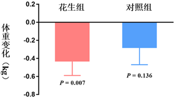 在由林旭研究员牵头的本项营养干预研究中,博士生汪荻,副研究员孙亮通过与复旦大学附属华东医院上海临床营养中心合作,招募到224名根据国际糖尿病联盟(IDF)中国人的标准定义的代谢综合征或高风险的志愿者(腹型肥胖伴有一项代谢综合征风险因素),并将其随机分配到花生干预组(共113人)或对照组(共111人)。在12周的干预过程中,志愿者每日在午餐和晚餐前一小时分别食用一小包28克的轻盐烤花生,或一份与烤花生等能量的白米糕(每日花生和白米糕均为1392千焦耳/日,约占20%每日总能量摄入)。所有志愿者均被告知维持他们干预前的膳食习惯和体力活动水平,干预中未完成的干预食物均被详细记录。通过比较两组志愿者在干预前后的数据发现:1)花生干预组代谢综合征的逆转率(即干预前符合IDF中国人诊断标准的代谢综合征志愿者在12周干预后不再符合此标准的比例)是对照组的2.33倍(RR 2.33; 95% CI: 1.10,4.89; P = 0.026)(图1A);2)在花生干预组高代谢综合征风险个体中的风险因素数量降低的比例为23.1%,高于对照组的14.3%,虽未达到统计显著性(图1B);3)尽管花生脂肪含量较高,但12周干预后花生组志愿者的体重比干预前呈边缘显著降低(P = 0.007)(图2)。总之,每日摄入适量花生替代部分精制谷物摄入,可以在不增加体重的情况下改善高风险个体的心血管代谢健康。