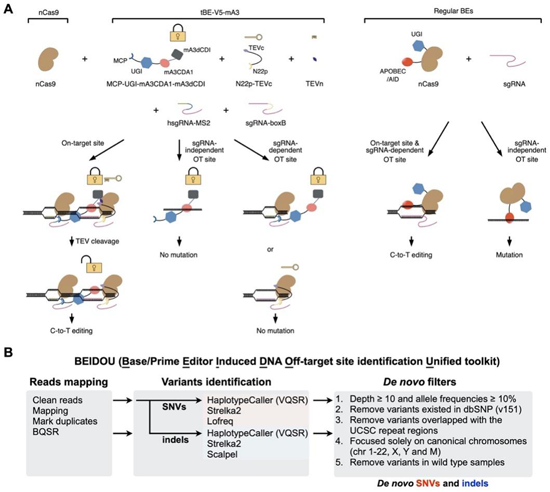 图示:(A) tBE作用的原理示意图。以tBE-V5–mA3为例,其可在靶位点去除dCDI产生高效编辑效果,但在OTss和OTsg位点时由于dCDI的存在可以抑制非靶向突变。(B) BEIDOU计算分析流程评估碱基编辑的潜在全基因组水平脱靶。