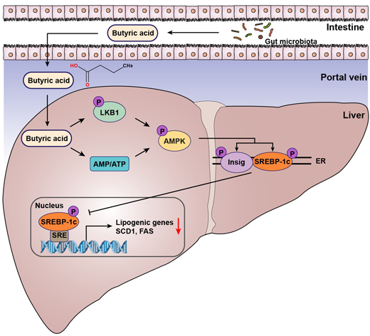 肠道菌群产生的丁酸通过门脉进入肝脏,激活LKB1-AMPK-Insig通路,抑制SREBP-1c的转录活性,从而下调脂质合成基因的表达,降低肝细胞脂质沉积水平,改善脂肪肝。靶向LKB1及Insig激动剂可为非酒精性脂肪性肝病的治疗提供新的思路和策略。