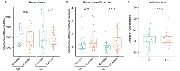 林旭研究组前期在对超重或肥胖女性开展的为期12周的全餐干预研究中,发现低碳水化合物膳食(LC组,40-50%E脂肪,<40%E碳水化合物)与限制能量的传统高碳水化合物膳食(CR组,55%E碳水化合物,限制35%能量)在减少体重和体脂含量方面具有相似的作用,但仅LC膳食能显著地改善高密度脂蛋白胆固醇(HDL-C)水平以及总胆固醇/HDL-C和甘油三酯(TG)/HDL-C比例。在此基础上,李亦学研究组、林旭研究组和曾嵘研究组合作,进一步对48名超重或肥胖女性的基线和12周干预后的肠道宏基因组、血液红细胞膜脂肪酸及血浆酰基肉碱进行了检测。马一玮博士、孙怡迪博士和孙亮副研究员经过系统性的分析,首次发现不同减重膳食干预导致两组志愿者的肠道菌群结构和功能、宿主血液脂肪酸和?;饧钏降牟钜煨员浠?。在12周的干预后,LC组的拟杆菌门/厚壁菌门比例显著增高(P = 0.015),而CR组仅存在增高趋势(图1b)。在菌群功能的变化方面,与CR组相比,LC组的支链氨基酸合成通路被抑制,而丝氨酸合成通路上调。在红细胞膜脂肪酸水平方面,与CR组相比,LC组的两种脂肪酸体内合成途径上的脂肪酸(14:0和16:1n-7)水平显著下降,EPA(20:5n-3)水平显著上升。尽管干预后两组的血浆?;饧钏骄毡樯仙?,LC组的短链?;饧钏接懈嗟奶嵘>鸩交毓榉治?,发现一系列菌群共丰度基因簇(CAG)、脂肪酸和?;饧畹谋浠胙纳葡灾喙?。值得注意的是,与脂肪酸和酰基肉碱的变化相比,菌群CAG变化对升高HDL-C水平(81.6%)和降低TG水平(89.3%)均有更大的贡献度(图2)。因此,本研究提示,在超重或肥胖的中国女性中,膳食模式干预导致的菌群结构的改变比宿主脂肪酸相关代谢的改变对于血脂改善的贡献度更大。总之,本研究为揭示膳食模式干预引起的肠道菌群和人体代谢物改变,及其与代谢标记物变化之间的联系提供了新的证据,为解读膳食-菌群-宿主间的复杂交互作用提供了有价值的参考。
