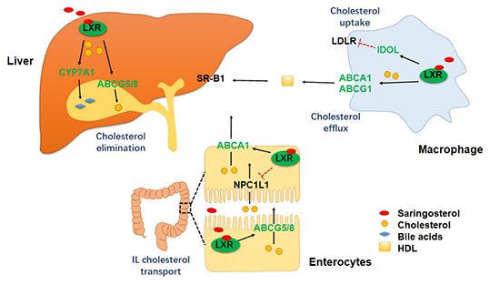羊栖菜是一种常见的可食用褐藻,具有多种生物活性,如抵抗肥胖等。研究组前期研究发现,从羊栖菜中提取的马尾藻甾醇,在体外可以选择性激活LXRβ,可能是一种天然的降胆固醇的药物(JAFC 2014 Jul 2;62(26):6130-6137)。在本研究中,研究人员通过高脂喂养的ApoE-/-小鼠构建动脉粥样硬化模型,研究结果显示马尾藻甾醇干预能够有效缓解动脉粥样硬化,降低血清胆固醇水平,同时,不会引起肝脏脂肪变性的不良反应。进一步研究发现,马尾藻甾醇可以调节肝脏,小肠及巨噬细胞中LXR的靶基因的表达,促进巨噬细胞胆固醇外排和抑制胆固醇的摄取,促进肝脏中胆固醇分解代谢和分泌,减少肠内胆固醇的吸收以及外排。综上所述,该研究表明马尾藻甾醇对LXRβ的激活具有选择性,能够降低血清胆固醇水平和抗动脉粥样硬化,为预防动脉粥样硬化提供新的策略。