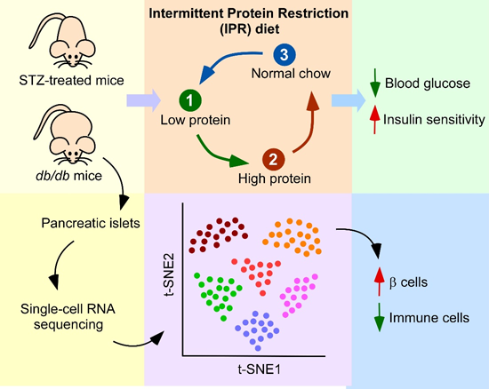 虽然持续的蛋白质或者氨基酸限制以及间歇性节食已被证明可以改善糖尿病,但目前还没有研究探讨间歇性的蛋白限制是否足以干预糖尿病。该项研究探讨了一种间歇性蛋白限制(IPR)的饮食方式,发现IPR可以迅速缓解STZ诱导的1型糖尿病小鼠以及瘦素受体缺陷导致的2型糖尿病小鼠的高血糖血症。针对小鼠胰岛的进一步研究发现IPR可以增加胰岛β细胞数量、促进β细胞增殖、并改善β细胞功能。在外周组织中,IPR可以减少肝脏的糖异生并提高骨骼肌的胰岛素敏感性。与持续性低蛋白饮食相比,IPR对于糖尿病小鼠的肝脏脂肪积累和损伤更轻。此外,通过小鼠胰岛单细胞测序分析发现了IPR可以逆转糖尿病导致的胰岛β细胞数量的减少以及胰岛免疫细胞的浸润。由于IPR这一饮食方式能够有效控制血糖并?;ひ鹊害孪赴冉郴蛉攘肯拗瓶赡芨菀妆蝗私邮?,并避免了持续性蛋白限制的不良作用,故IPR在未来有较大的应用转化潜力。