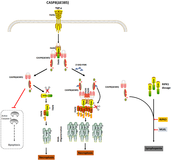 图:Caspase-8蛋白通过自我剪切调控细胞死亡及促进免疫缺陷疾病的作用模式图