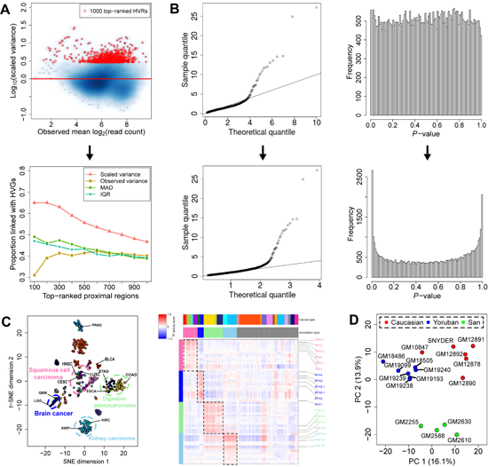 图:(A) HyperChIP模型以校正了均值-方差关系的标度方差(scaled variance)为统计指标, 使不同信号强度水平的基因组区域之间的信号差异水平更加可比。(B)通过引入区域筛选和缩尾处理等手段来控制潜藏真阳性对参数估计的影响,显著改善了HVR识别的统计功效。(C)将HyperChIP应用于TCGA pan-cancer ATAC-seq数据集,基于所得HVRs将部分组织来源或细胞形态相近的样本归类定义为四个癌症超类型(super class),即脑部肿瘤(Brain cancer)、肾癌(Kidney carcinoma)、消化道腺癌(Digestive adenocarcinoma)和鳞状细胞癌(Squamous cell carcinoma);下游的转录因子活性打分分析,发现了大量被每个超家族中肿瘤样本所共有的转录调控因子。(D)比较十余个不同人类个体的淋巴母细胞系CTCF ChIP-seq数据,发现基于所得HVRs能很好地区分不同种群个体的样本。