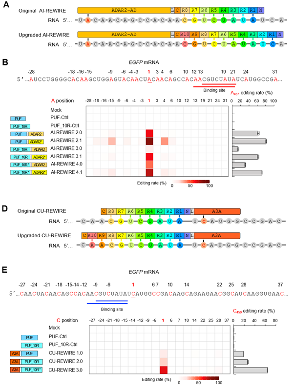 2022年8月27日,中国科学院上海营养与健康研究所的王泽峰团队在Nucleic Acids Research杂志发表长文“Programmable RNA base editing with a single gRNA-free enzyme”。该研究报道了一种单一组分的新型可编程RNA单碱基编辑系统REWIRE(RNA editing with individual RNA-binding enzyme),可以在人体细胞中实现高达60%-80%的A-to-I或C-to-U编辑。该系统利用一种人源PUF蛋白来靶向识别RNA序列。PUF蛋白包含一个RNA结合域,称为Pumilio同源域或PUF域,这个RNA结合域通常由八套36个氨基酸的重复序列组成。每个重复序列上有三个氨基酸残基在和RNA的结合中起重要作用。通过对可编程PUF结构域的设计和对其长度的优化,该系统可以实现对8-10nt的目标序列精准定位高效编辑靶标的同时降低脱靶效应。
