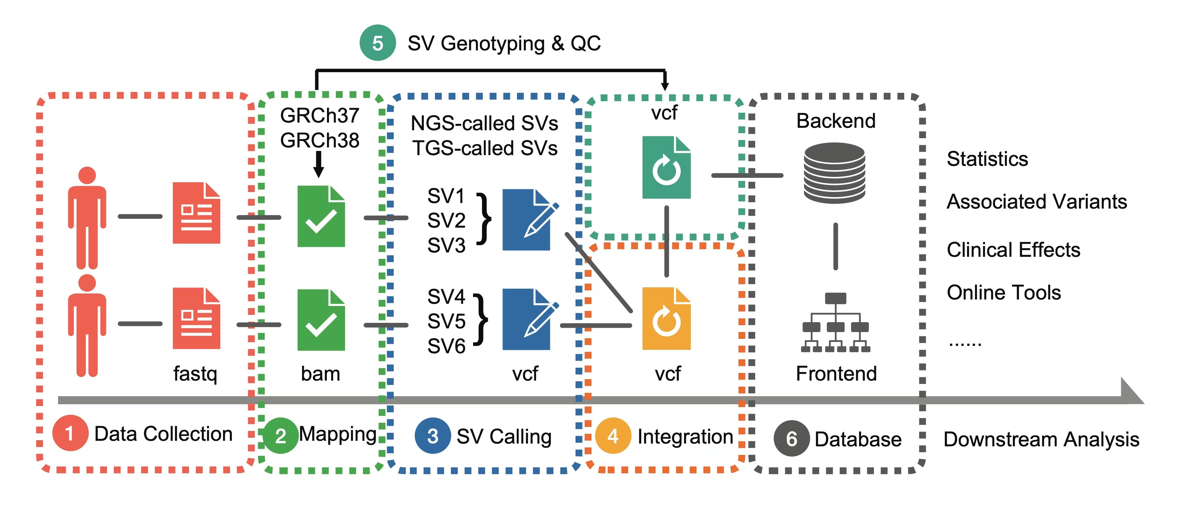 总体而言,PGG.SV提供了一个高质量的人群基因组结构变异数据资源,基于新一代测序数据对人类基因组结构变异信息检测和展示进行了大幅度提升,尤其是首次较为全面地覆盖了东亚人群和中国人群的结构变异多样性,并提供相关基因和潜在临床效应的注释。此外,该平台也提供了包括病例对照研究在内的多种在线分析功能,以及人类基因组结构变异的可视化工具。
