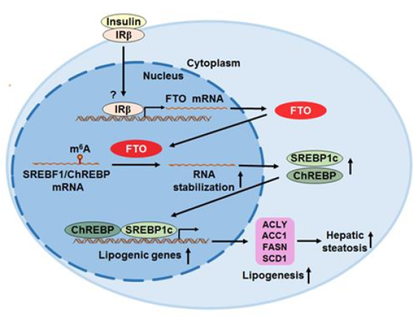 注:胰岛素刺激肝细胞后,FTO的表达增加。FTO可以通过m6A去甲基化来稳定SREBF1ChREBPmRNA,从而导致其蛋白质水平增加,最终促进了肝脏脂肪生成,导致肝脏脂肪变性。