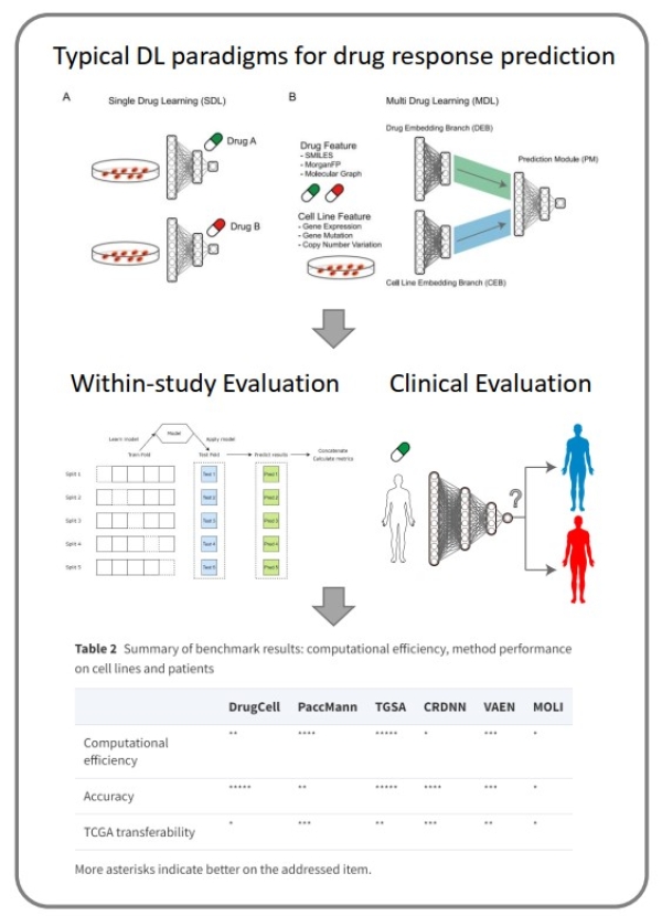 基于分子组学预测药物对肿瘤的杀伤效果是癌症个体化治疗中的一个重要方向。近期研究结果显示,深度学习模型相比经典的机器学习模型能提高预测性能。然而,目前缺乏对不同深度学习方法的系统性比较,尤其是从临床前模型到临床数据的模型迁移能力。研究人员使用九个评估指标对六种具有代表性的药敏预测深度学习方法,在多个应用场景中的性能进行了评估,包括整体预测准确性、单个药物水平的可预测性、预测性能的潜在相关因素、以及细胞系模型用于临床患者的迁移能力等。结果显示,大多数方法在细胞系数据集中有良好的预测性能,其中基于蛋白质-蛋白质关联的双图神经网络算法对肿瘤细胞系组学特征的捕捉能力更强,准确性更好。由于细胞系和患者肿瘤样本之间的差异,细胞系上训练的模型应用于患者时,性能指标会出现不同程度的降低,但是几种单药模型仍然能在部分药物上取得可靠的预测结果。