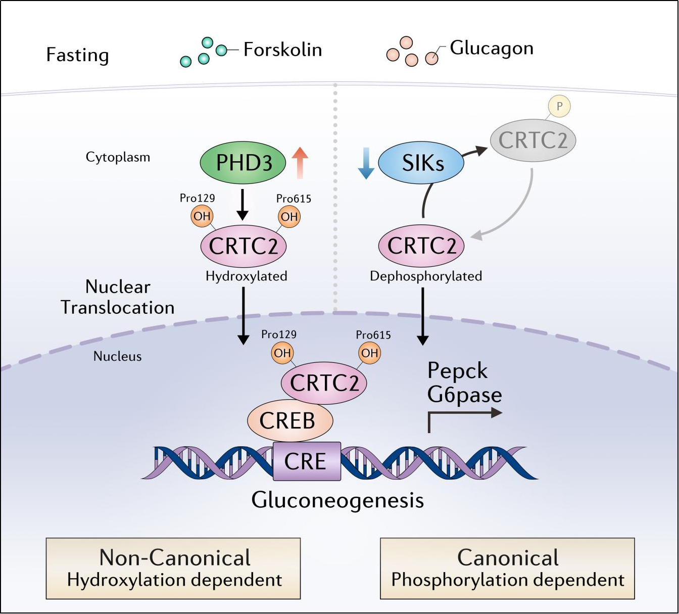 在禁食或胰高血糖素刺激条件下,PHD3结合并羟基化CRTC2的Pro129和Pro615位点,导致CRTC2的核转位和CREB/CRTC2途径激活,促进糖异生基因表达和肝糖输出。CRTC2羟基化是一种非经典的CRTC2翻译后修饰,独立于经典的CRTC2磷酸化修饰对肝脏糖异生的调控。