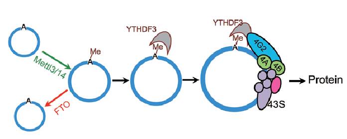 人的细胞中所有的已知mRNA都含有5’端帽结构,这一帽结构是大部分mRNA翻译所必需的。然而在一些特殊情况如细胞应激条件下,有些 mRNA可以不依赖于帽结构而靠一个叫IRSE的順式调控原件来从mRNA的中间启动翻译。这种IRES驱动的蛋白翻译在RNA病毒中很常见,但只在一小部分的真核细胞mRNA中发现。在王泽峰组的前期工作中,他们发现插有IRES的编码GFP的环状RNA可以在细胞中被翻译。而新的工作中,他们发现环状RNA中富含m6A甲基化修饰,而且这些碱基修饰可以像IRES一样驱动环状RNA翻译。王泽峰研究员认为,“这两个发现放在一起,就可推断出有大量的环状RNA被翻译成蛋白质这一令人惊讶的结论,说明人的细胞中存在有大量的环状RNA编码的未知蛋白?!?这是一个有很令人兴奋的结论,说明人类蛋白质的多样性远比从前想的大。