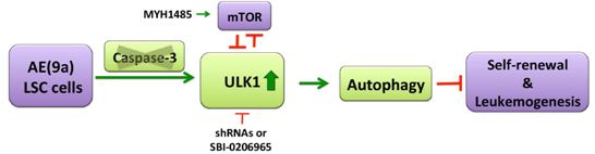 研究人员利用遗传小鼠模型,证明Caspase-3缺失可以延缓t(8;21)白血病的发生。从分子水平研究揭示Caspase-3能够直接切割自噬调控因子ULK1D458位点, Caspase-3的缺失能够促进ULK1蛋白激酶的上调,从而促进白血病细胞自噬。白血病中蛋白水解酶Caspase-3,一方面通过水解ULK1蛋白激酶,另一方面也可以通过mTOR/P70S6K/4EBP1信号通路,抑制细胞自噬发生。王兰研究组通过与迈阿密大学肿瘤研究中心Stephen Nimer教授合作,证明Caspase-3及其调控的细胞自噬信号通路与白血病发生紧密相关。