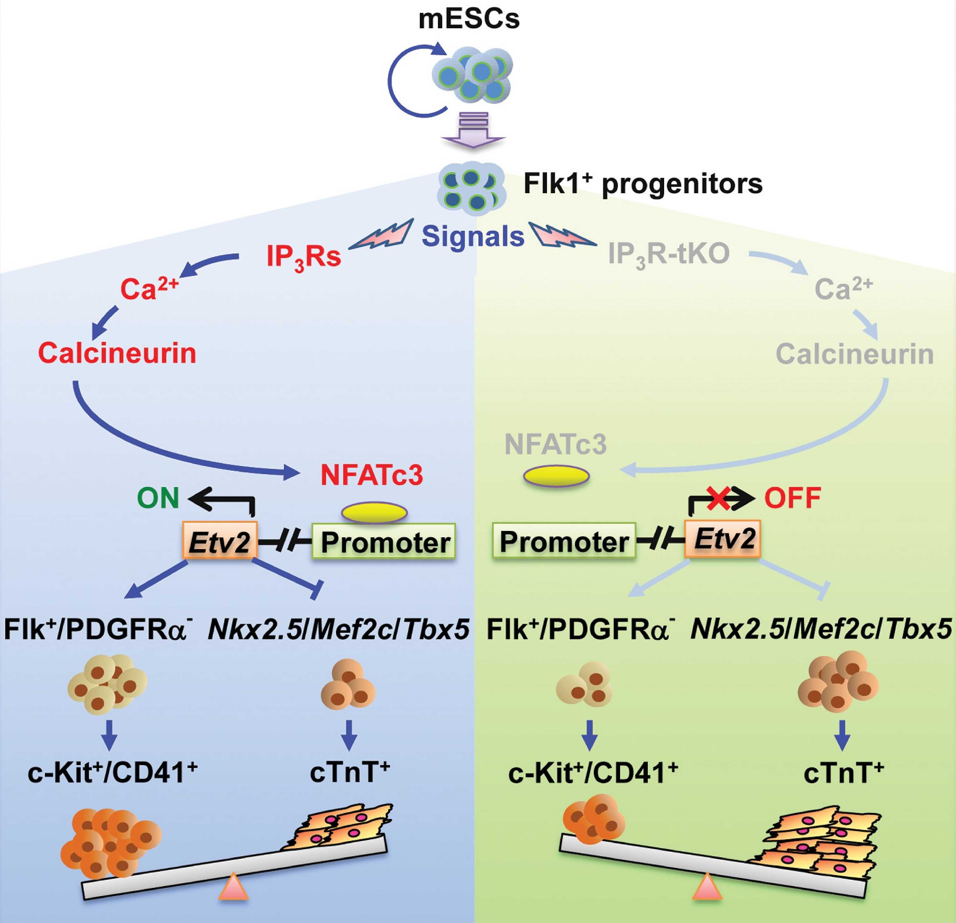 图. IP3Rs释放的Ca2+通过calcineurin-NFATc3-Etv2信号通路,调控造血谱系和心肌谱系分化命运决定?