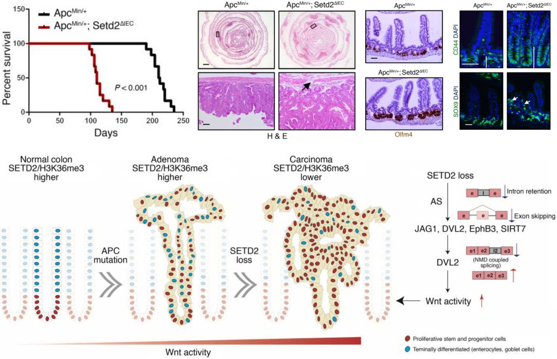 组蛋白遗传修饰酶的异常表达或功能紊乱在肿瘤发生发展中发挥重要作用。在哺乳动物细胞中,SETD2是最主要的H3K36me3修饰酶,调节基因转录。研究发现SETD2在肿瘤组织中存在高频突变或缺失,尤为显著的是在肾癌中,在其他癌症如乳腺癌、肠癌、胃肠道间质瘤中也有报道。但目前尚未有证据阐明SETD2体内的功能。博士研究生袁怀瑞、李霓等在秦骏研究员指导下,利用遗传小鼠模型和病人数据验证,揭示SETD2缺失可以协同Wnt信号活化促进肠癌的发生发展。在正常肠道干细胞中,Wnt信号通路被控制在合理的阈值,既维持了干细胞自我更新及增殖,同时保证肠干细胞终末分化。肿瘤中SETD2的缺失打破了Wnt信号在肠道干性维持及终末分化间的平衡,导致腺窝底部干细胞快速增生形成癌前组织?;蒲芯勘砻髌渫ü跋霨ene body区H3K36me3的水平,调控众多与肿瘤相关基因RNA的选择性拼接。SETD2的下降,造成Wnt信号关键调节基因DVL2的 intron retention减少,从而避免DVL2的NMD,最终过度激活Wnt信号通路,导致肠干细胞及前体细胞的恶性转化。鉴于SETD2具有酶活,存在小分子药物靶向的可能性,因此本项目的完成将可能对于肠癌的治疗提供新的策略。同时SETD2调控机制的解析也将有助于我们在表观调控层面对于肠癌发生发展进一步了解。