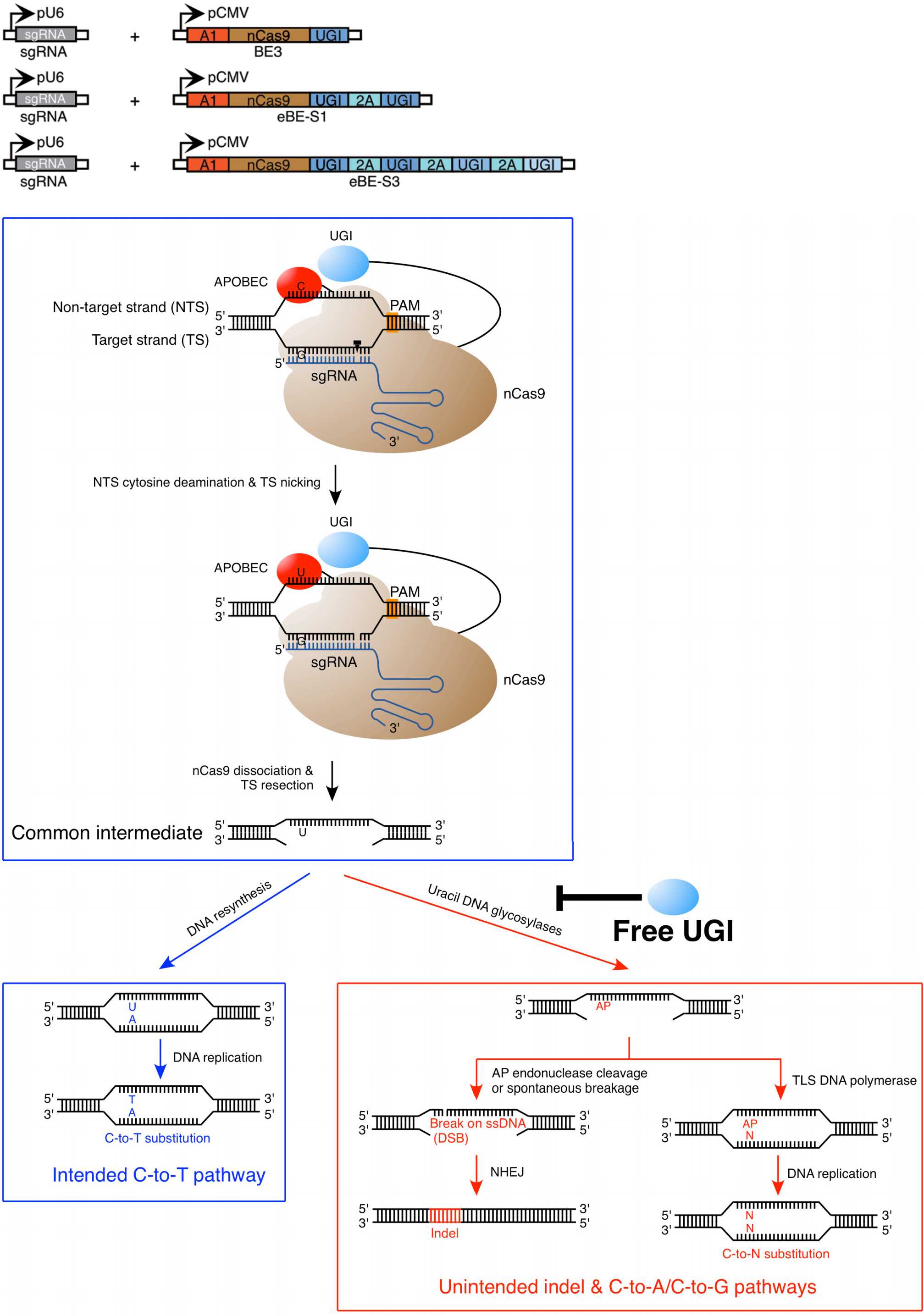 近年內兴起的CRISPR/Cas9基因编辑技术利用可设计的Cas9核酸酶通过碱基插入、缺失或替换等方式,对生物体基因组DNA特定片段进行改造,进而实现对靶基因的编辑。传统的CRISPR/Cas9基因编辑技术虽然具有较高的基因敲除效率,但其在执行碱基替换(对譬如基因突变进行矫正)的效率通常很低,这也限制了CRISPR/Cas9基因编辑工具从科研向应用的全面转化。近期发展出的碱基编辑(base editing)系统,由CRISPR/Cas9和APOBEC胞嘧啶脱氨酶两个独立的体系整合而成,可在基因组靶向位点实现由胞嘧啶(cytosine, C)向胸腺嘧啶(thymine, T)的编辑改造(Komor et al., Nature?2016)。其中,BE3虽然实现了较高的C至T编辑效率,但是也伴随着较高水平的非目的性碱基插入或缺失(insertion/deletion, indel)和C至A或G的编辑副产物,这些都显著地降低了碱基编辑器在基础研究和临床上的深入应用。在这项最新的研究中,科研人员在前期对BE3导致非目的性突变机制探索的基础上,利用共表达UGI的方法,成功开发出了增强型基因组碱基编辑器-eBE。利用多种UGI与BE3共表达的策略,eBE实现了更高精度和更高效率的碱基编辑,为碱基编辑技术在基础研究及未来临床领域的深入应用提供了新方法和新思路。