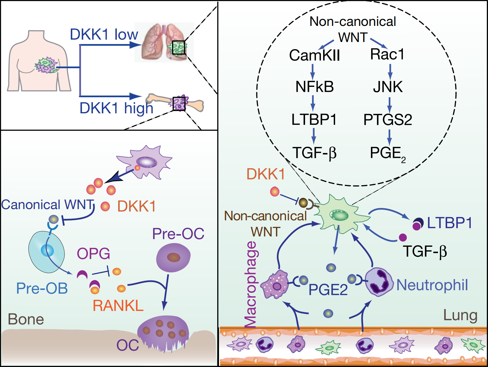 博士研究生壮雪倩在胡国宏研究员的指导下,发现肿瘤分泌的WNT信号抑制蛋白DKK1调控了癌细胞转移时对靶器官的选择性。DKK1高分泌的肿瘤倾向转移到骨,而低分泌的肿瘤倾向转移到肺。他们通过与山东大学团队合作发现乳腺癌病人血清中DKK1蛋白水平可预测乳腺癌骨转移和肺转移的风险。进一步的功能研究表明,DKK1在肺和骨转移微环境中通过靶向不同细胞的不同信号通路从而发挥相反的转移调控作用。在肺中DKK1抑制非经典WNT通路,减少巨噬细胞和中性粒细胞的招募并同时抑制癌细胞分泌生长因子TGFβ的水平,从而抑制肺转移。而在骨中DKK1通过抑制成骨细胞的经典WNT信号,从而促进骨转移形成。对肿瘤施用经典WNT信号通路抑制剂后,肺转移并未显著下降而骨转移情况恶化。相反的,联合使用JNK和TGFβR抑制剂能够同时抑制肺转移和骨转移。