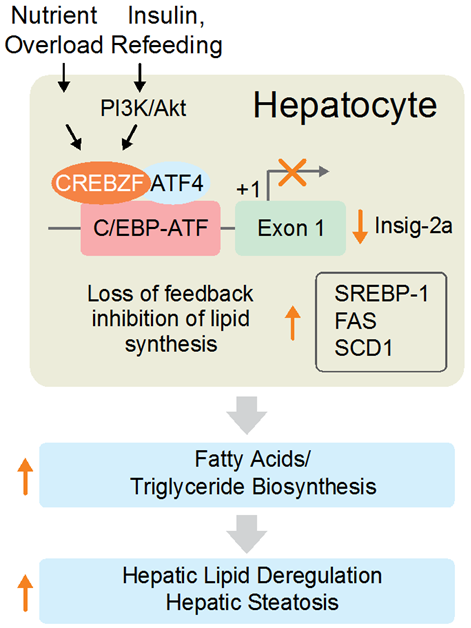 脏中CREBZF对Insig的转录调控模型:治疗肝脏脂代谢紊乱与脂质沉积的潜在作用方式