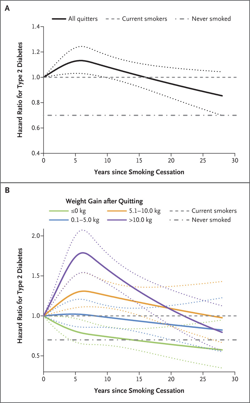 图一、戒烟后,总人群中的2型糖尿病风险先短暂上升随后逐渐下降(图A)。根据戒烟后六年的体重增长分层后,发现体重增长最多组(图B紫色线)2型糖尿病的发病风险升高幅度最大,体重不增长者(图B绿色线)则持续降低。