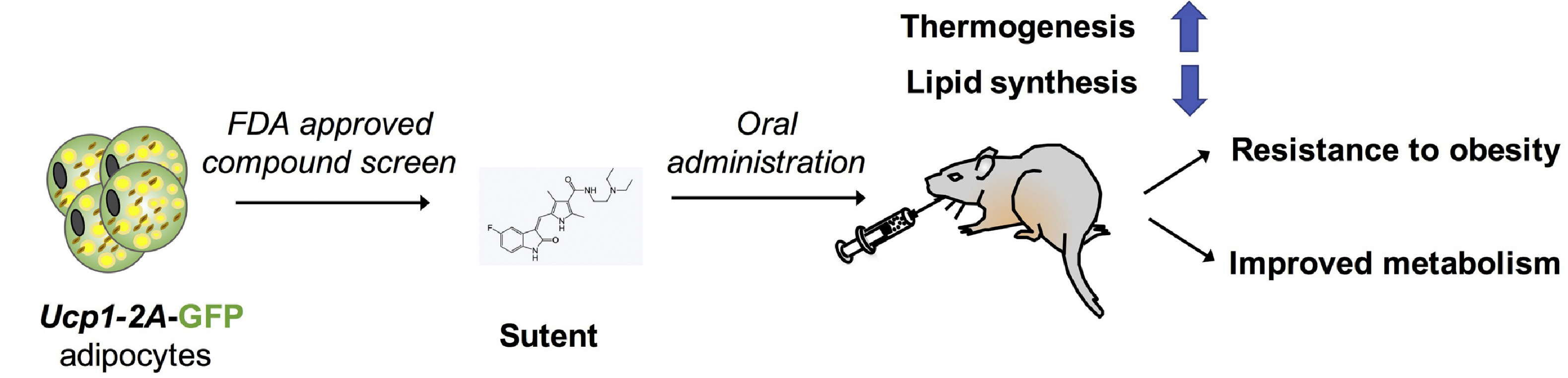 图注:我们通过Ucp1-GFP脂肪细胞株筛选一个小分子化合物库,发现一个可以显著促进UCP1表达的药物——索坦(Sutent),利用小鼠模式动物,通过体外和体内验证,索坦可以促进机体非颤抖性产热和抑制脂质合成从而抵抗由高脂饮食诱导的肥胖,并改善机体代谢。