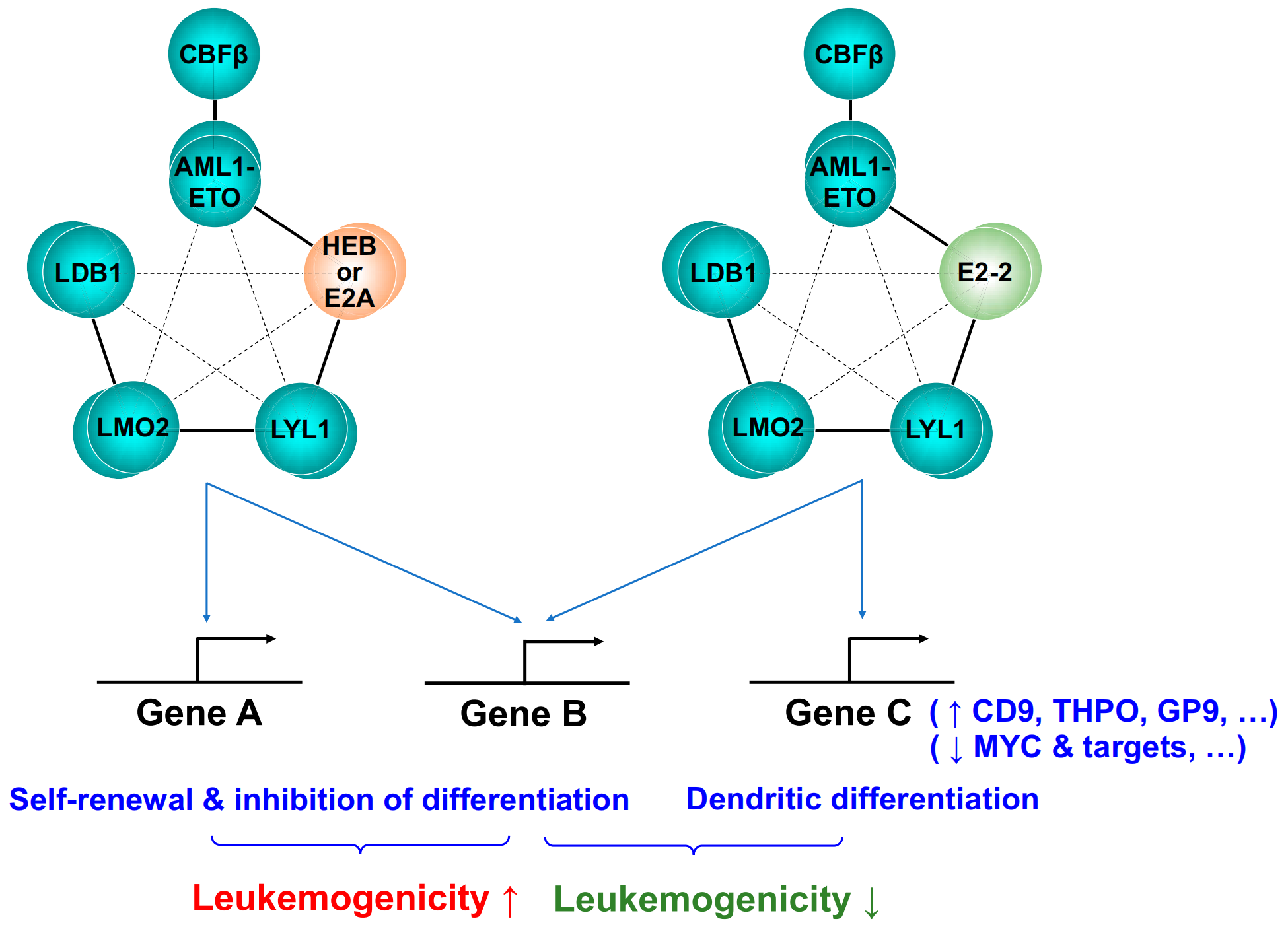 研究发现,过表达E2-2可以特异性地抑制携带AML1-ETO融合基因的Kasumi-1细胞生长,并且该作用是依赖于E2-2的bHLH(basic helix-loop-helix)结构域的。对Kasumi-1细胞进行了RNA-seq和ChIP-seq的分析,发现E2-2能将AETFC转移到一些新的靶基因上,激活与细胞分化相关的基因例如THPO,诱导白血病细胞向树突状细胞分化。在白血病患者标本中,E2-2的表达在M2b亚型中相对较低,并且E2-2的靶基因THPO的表达水平与患者的复发率存在相关性;在小鼠模型中,抑制E2-2的表达能够加快AML1-ETO介导的白血病发生。这些结果表明E2-2可能形成一个新的AETFC亚型,通过调控AETFC异质性从而扮演了t(8:21)白血病的负调控因子的角色。