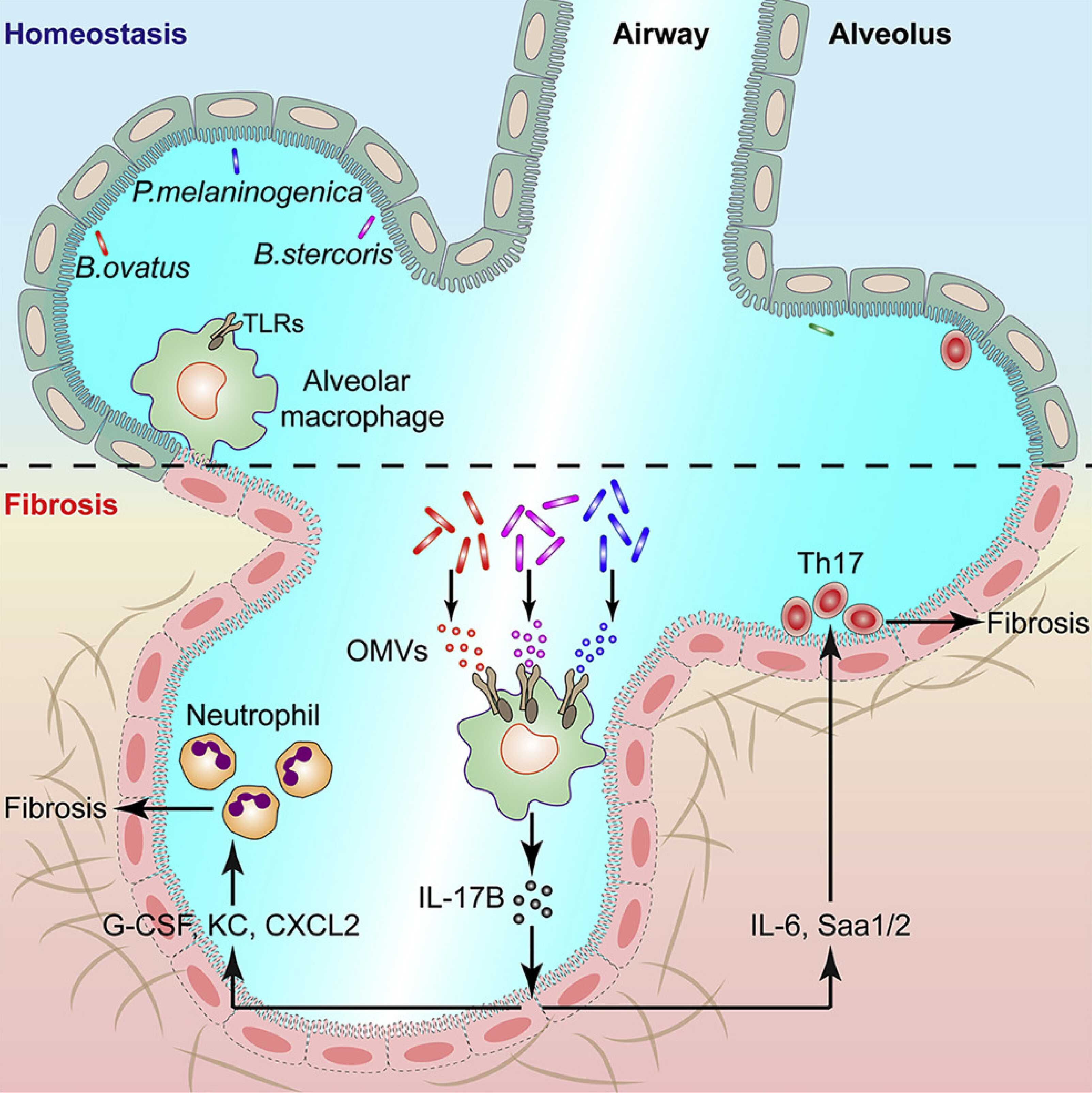 通过高通量测序等手段研究人员发现在正常小鼠肺组织中也存在着相对丰富的微生态菌群,而在肺纤维化病理组织中菌群发生明显紊乱,并且紊乱的肺部菌群对肺纤维化的发生至关重要。接下来的研究发现肺部菌群可以通过诱导IL-17B的表达促进肺纤维化的发生。抗生素清除肺部菌群的小鼠、无菌小鼠以及IL-17B缺失的小鼠都表现出肺纤维化减轻的表型。进一步研究鉴定发现Bacteroides和Prevotella两个属的细菌在肺纤维化过程中明显升高,并且可以通过分泌OMVs促进IL-17B的分泌。利用骨髓移植、细胞分选等实验手段研究发现IL-17B主要由肺泡巨噬细胞产生,并且发现OMVs是通过其携带的脂多糖和脂蛋白等成分作用于肺泡巨噬细胞的TLR2、TLR4受体激活下游Myd88介导的信号从而促进IL-17B的表达。此外,研究发现IL-17B可以直接作用于肺部上皮细胞诱导下游基因的表达从而促进中性粒细胞的招募以及Th17细胞的分化最终促进肺纤维化的发生。