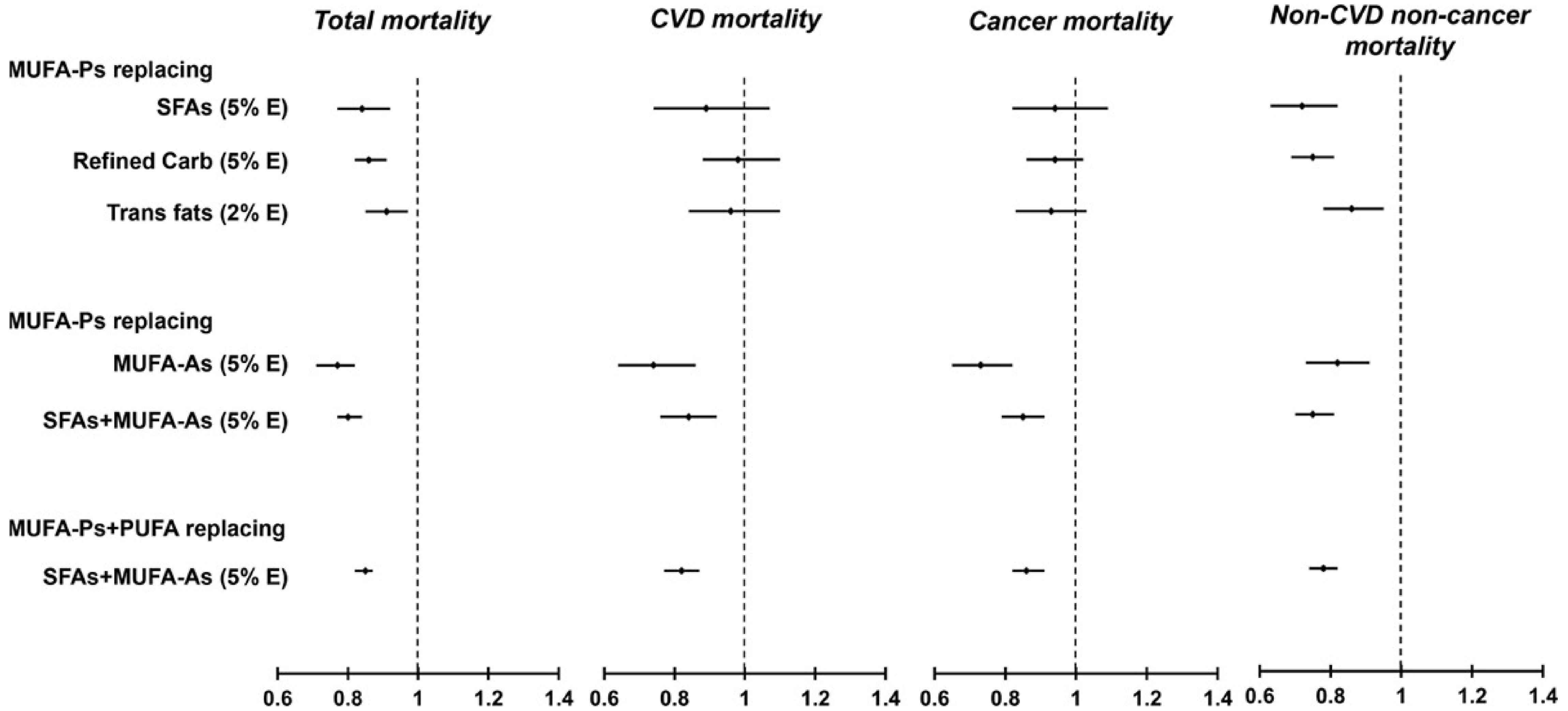 本研究纳入了2个大规模的前瞻性研究队列【护士健康研究(Nurses' Health Study)、健康医护人员研究(Health Professionals Follow-up Study)】的近10万名调查对象,研究人员根据每四年一次的饮食问卷(FFQ)和产期更新的食品成分数据库评估调查对象的长期膳食状况。在22年的随访期内,共发现死亡案例20,672例。通过统计分析,研究人员发现总MUFAs和MUFA-Ps与总死亡率呈负相关,而MUFA-As与总死亡率呈正相关。尤其值得引起注意的是,当植物来源的MUFA替换相同热量(按每日总能量摄入的5%计算)的饱和脂肪酸时,总死亡率下降16%;替换精加工的碳水化合物时,总死亡率下降14%;替换动物来源的MUFA时,总死亡率下降23%,心血管疾病死亡率下降26%,癌症死亡率下降27%,其它死亡率下降18%(下图)。