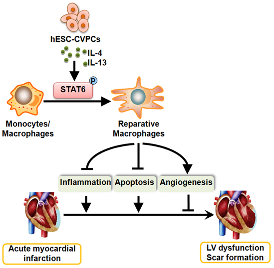 图. hESC-CVPCs对急性心肌梗死的修复作用。hESC-CVPCs通过旁分泌IL-4与IL-13,激活巨噬细胞STAT6并促进巨噬细胞向修复型极化,从而调节急性心梗后炎症反应,减少心梗后心肌细胞凋亡,增加血管新生,并改善了心脏功能。