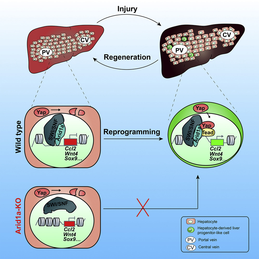2019年7月3日,国际著名学术期刊Cell Stem Cell在线发表了题为“A Homeostatic Arid1a-Dependent Permissive Chromatin State Licenses Hepatocyte Responsiveness to Liver-Injury-Associated YAP Signaling”的研究论文。该研究由中国科学院分子细胞科学卓越创新中心惠利健研究组与中国科学院上海营养与健康研究所李亦学研究组合作完成。该研究发现染色体重塑调控蛋白Arid1a介导肝细胞重编程基因在正常的肝细胞中预打开,使肝细胞具有响应损伤诱导的YAP信号而转录激活重编程基因的潜能,揭示了肝细胞去分化可塑性的分子基础。