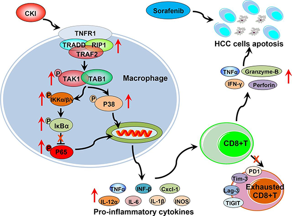 复方苦参注射液在临床上被批准用于治疗癌症引起的疼痛。前期研究表明复方苦参注射液能提高肝动脉插管化疗栓塞的治疗效果,但复方苦参注射液在调节肝癌免疫微环境以及肝癌治疗方面仍不清楚。在本研究中,博士研究生杨阳等在王慧研究员、巴乾副研究员和杨成华研究员的指导下,通过体内和体外实验发现复方苦参注射液通过抑制促肿瘤M2-TAMs的浸润及分化,提高抗肿瘤M1-TAMs的浸润及分化,从而增加肿瘤微环境中的CD8+T细胞数量并增强CD8+T细胞的肿瘤杀伤能力,同时降低CD8+T细胞的功能耗竭来维持持续的免疫杀伤活性。作为免疫调节剂,复方苦参注射液增敏低剂量索拉菲尼的肝癌治疗效果,抑制肝癌复发,并降低索拉菲尼的肝脏毒性?;蒲芯拷沂靖捶娇嗖巫⑸湟喊邢騎AMs表面TNFR1及其介导的NF-κB/P65、P38/MAPK信号转导促进抗肿瘤M1-TAMs的分化,进而激活CD8+T细胞的抗肿瘤活性。综上,该研究揭示了复方苦参注射液抗肝癌的作用机制,表明传统中药复方作为免疫调节剂与化疗药物联合使用可能是肝癌治疗的一种新策略。