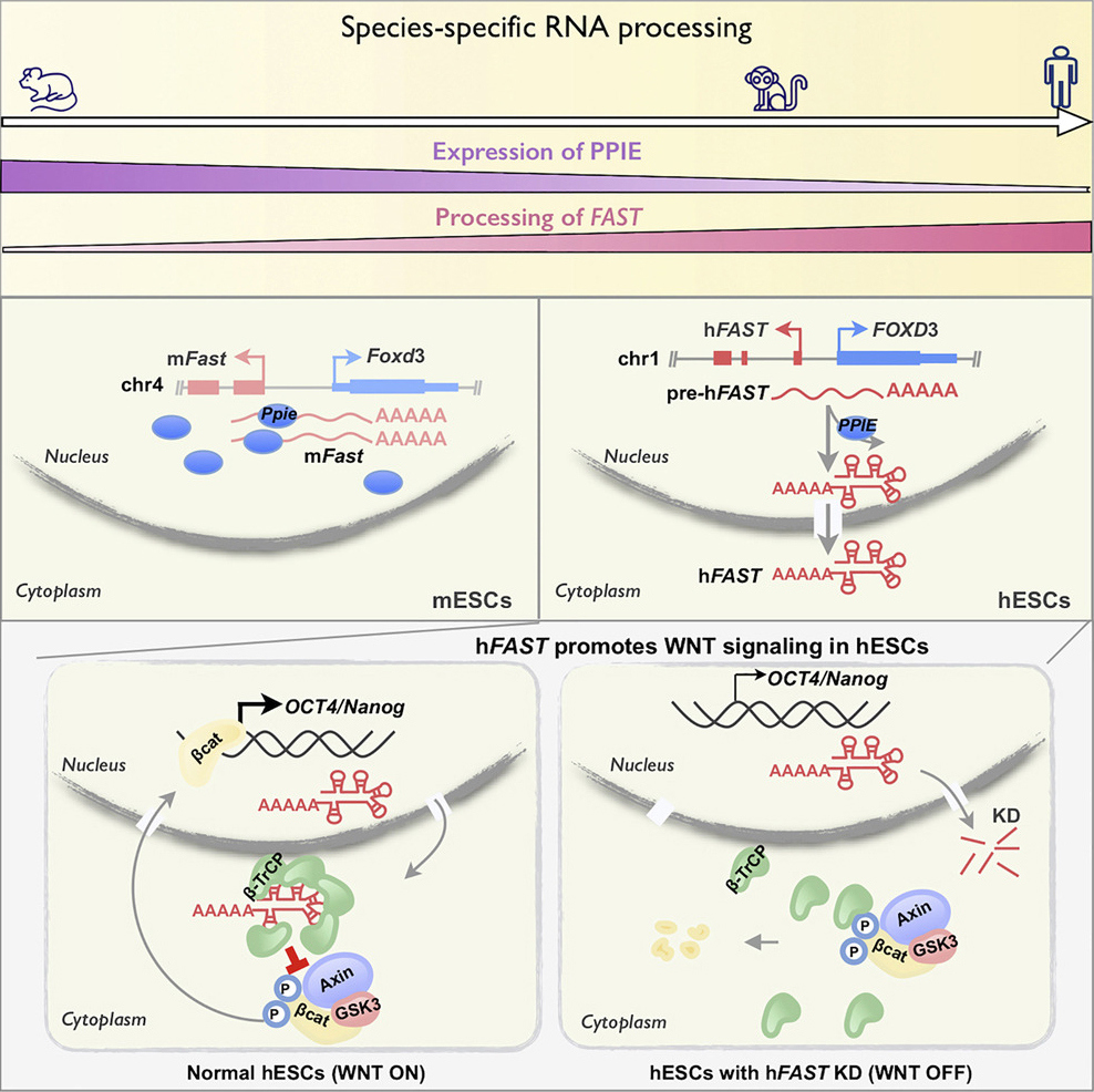 在这项研究中,科研人员基于细胞核和细胞质分离的人、鼠胚胎干细胞来源的高通量测序数据,针对序列及基因组位置保守的一类长非编码RNA进行了加工及亚细胞定位分析,发现人胚胎干细胞中长非编码RNA更多地定位于细胞质,而小鼠胚胎干细胞中长非编码RNA则更多地滞留于细胞核。实验上进一步证明了人、鼠不同亚细胞定位的长非编码RNA具有不同功能并详细解析了其中一个新型的长非编码RNA——hFAST维持人胚胎干细胞自我更新的分子机制。为了进一步探究长非编码RNA在不同物种间加工定位差异的分子机制,研究人员结合生物信息学分析预测和实验验证筛选到了调控它们不同定位的关键因子PPIE。分析发现在鼠、猴、人胚胎干细胞中PPIE表达成下降趋势,而长非编码RNA加工水平则成上升趋势,且长非编码RNA在人胚胎干细胞中更加倾向定位在细胞质中。深入实验分析进一步证明了PPIE蛋白对长非编码RNA(包括FAST)的剪接加工及亚细胞定位的调控作用。上述研究首次揭示了非保守的RNA加工和定位对长非编码RNA功能发挥的重要作用,从而提示长非编码RNA的姿态万千可能是物种特异性的调控和适应的一个重要机理,为物种差异长非编码RNA的研究提供了新基础和新思路。