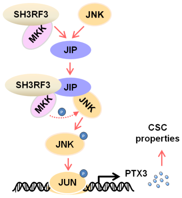 此项研究发现,在乳腺癌细胞模型中,过表达SH3RF3提升了乳腺癌细胞的肿瘤细胞球形成能力及其致瘤性。在乳腺癌病人来源的类器官体中同样证实了SH3RF3对肿瘤干性特征的促进作用。这表明SH3RF3的表达能够提升乳腺癌细胞的干性特征,增强乳腺癌细胞的恶性程度?;蒲芯勘砻?,SH3RF3能够与MKK-JNK复合体相互作用,以JIP依赖的方式促进JNK-JUN信号通路的激活,进而促进PTX3的表达,最终提升肿瘤细胞干性特征,增强肿瘤细胞的恶性程度。病人来源的肿瘤样本分析也证实SH3RF3与肿瘤细胞的干性特征存在明显的相关性,并与病人的不良预后相关。