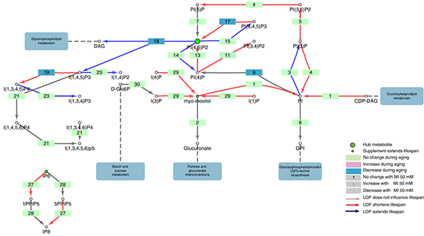 图1:线虫myo-inositol的代谢通路图。每个圆圈表示一个代谢物。每个方格指代一个酶,用数字代替。列出的代谢物和酶均是线虫中存在的。绛红色方格表示该步反应的酶在衰老过程中mRNA水平上升,蓝色方格反之。红色箭头指示减少该代谢物缩短线虫寿命,蓝色箭头反之(本图只标注p < 0.05的数据)。