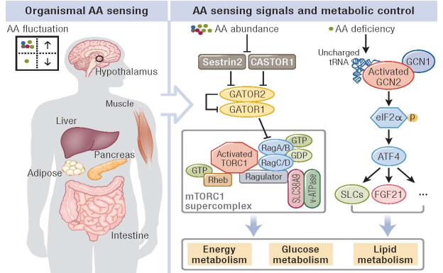机体能量和糖脂代谢稳态失衡是诱发代谢性疾病的主要驱动因素。众所周知,遗传和营养是导致代谢失衡的主要因素,其中营养可通过调控代谢器官或组织细胞信号网络来影响代谢性疾病的发生发展?;灏蠛炅坑兀禾?、脂类和氨基酸。传统观点认为氨基酸只是作为机体合成蛋白质和肽类的主要原料,但近年来其作为信号分子参与代谢稳态的维持和调控受到广泛关注。研究报道,支链氨基酸(包括亮氨酸、异亮氨酸和缬氨酸)与人群肥胖及2型糖尿病的发生密切相关,揭示了氨基酸营养失衡可能是代谢性疾病发生的重要因素。这其中的调控机制也陆续被报道,即氨基酸作为信号分子,其水平的升高或降低会激活或抑制相应代谢器官或组织中细胞的营养感应信号通路,并进一步调控糖脂等代谢的平衡。那么,机体主要代谢器官,包括中枢下丘脑、肝脏、胰腺和脂肪组织等对氨基酸水平的改变是如何感应的?以及这些代谢器官感应氨基酸改变之后如何调控机体能量和糖脂代谢的?阐述这些问题对于解析人类代谢性疾病的发病机理及相关药物研发具有重大意义。在该综述论文中,对氨基酸的感受器及其信号转导通路,特别是mTORC1和GCN2信号通路进行了详尽的梳理;全面总结了氨基酸感应信号调控机体能量和糖脂代谢的最新研究进展;结合氨基酸代谢特征与人群代谢性疾病发病的相关性,讨论了两者之间的因果关联,并对氨基酸感应信号作为开发治疗人类代谢性疾病和癌症的潜在药物靶标进行了探讨;针对氨基酸感应机制未来研究方向及其靶向药物研发存在的局限性和问题进行了总结、探讨和展望。