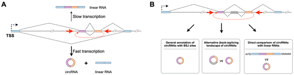 图示:(A) RNA Pol II的快速转录会促进环形RNA的生成。(B) 环形RNA注释、可变反向剪接事件和环形RNA与其对应线形RNA精准定量及比较。
