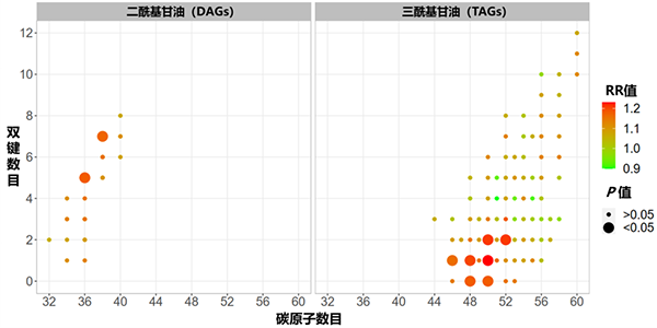 甘油酯是人体主要的一种脂类和最大的能量储存物质,由单?;视停╩onoacylglycerols, MAGs)、二?;视停╠iacylglycerols, DAGs)和三?;视停╰riacylglycerols, TAGs)组成。其中,细胞内DAGs是一种生物活性脂质,可作为诱导胰岛素抵抗的第二信使,而现有证据也支持TAGs在脂肪酸氧化和脂质合成中起到重要的调节作用。然而,目前循环系统中甘油酯与2型糖尿病的前瞻性研究仍较为缺乏,并且对其中潜在机制的了解还十分有限。