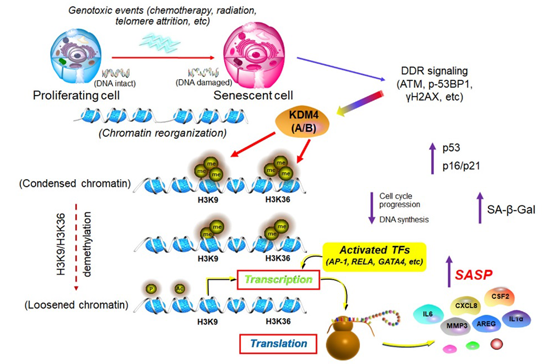 图.KDM4介导的表观修饰在衰老细胞中引起全基因组3D空间变化和染色质拓扑重塑最终造成SASP持续性高度表达
